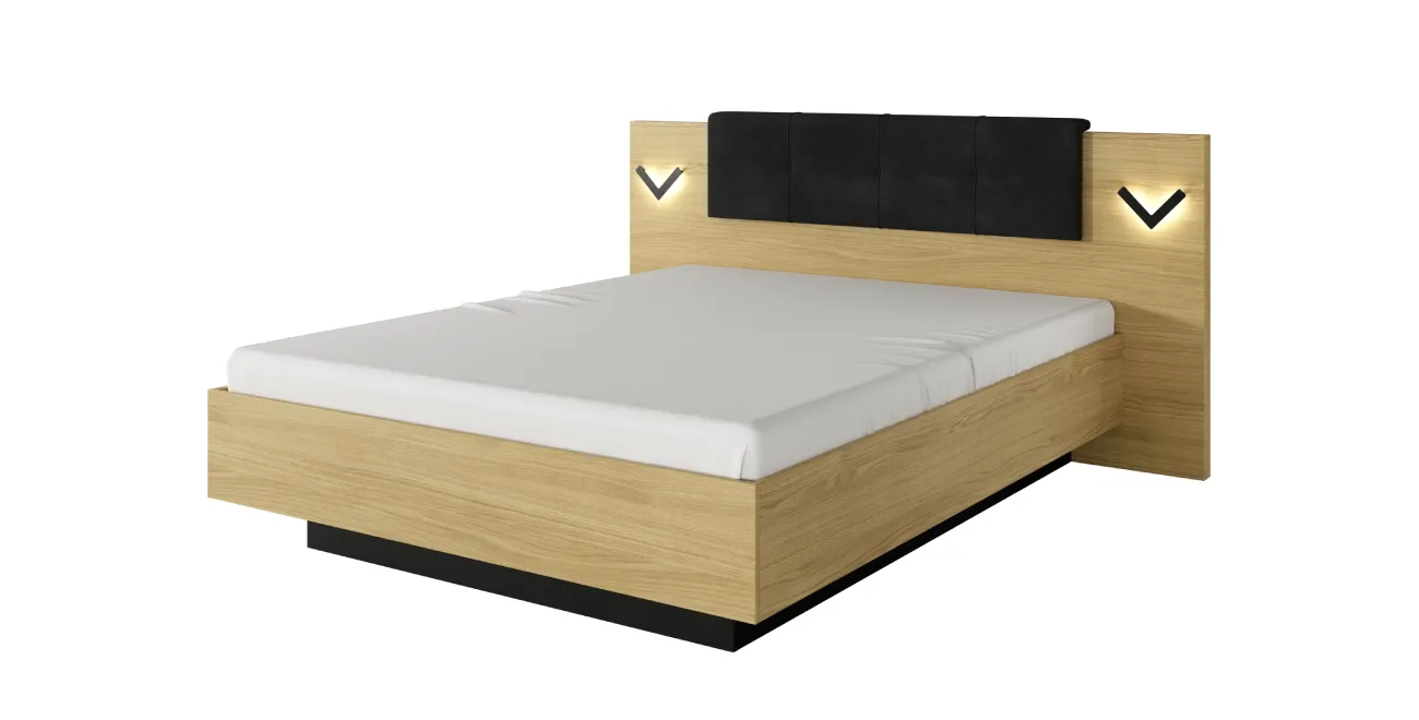 • Bett mit Bettkasten und LED mit Holzrahmen  VERSO Scandi Eiche/Schwarz