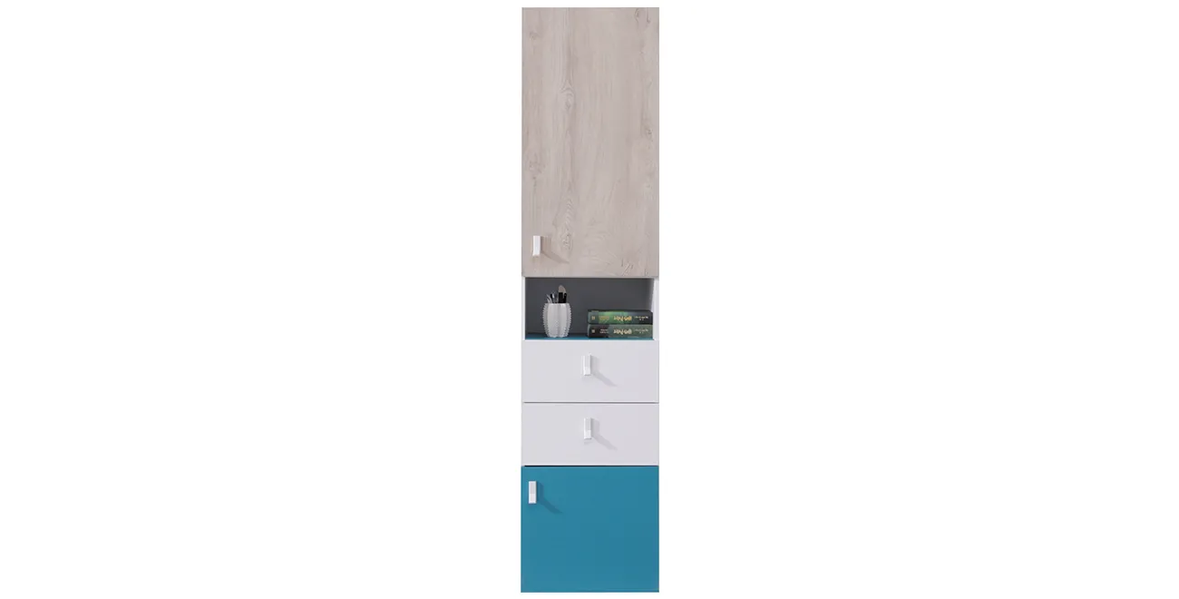 • Zweitüriges Bücherregal mit Schubladen und einer Nische Planet 4 L / P - weiß lux / eiche / meer